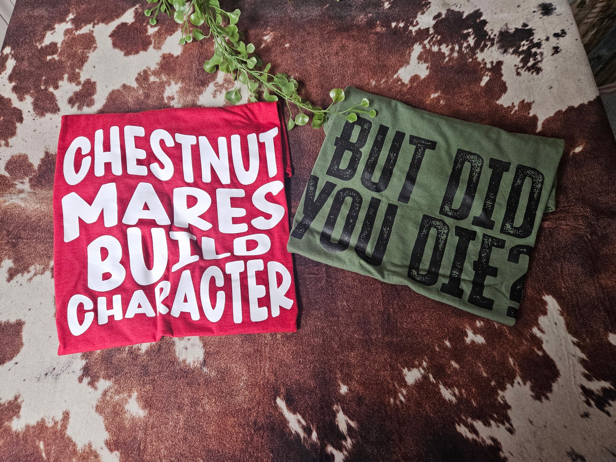 This bundle includes (1) SMALL Chestnut Mares Build Character Tee & (1) SMALL But Did you Die? Tee