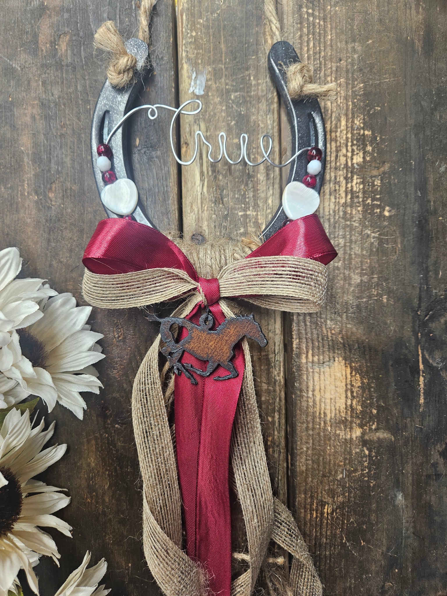 This rustic horseshoe design with its cranberry beading with white heart accents is a beautiful gift for any horse loving girl.