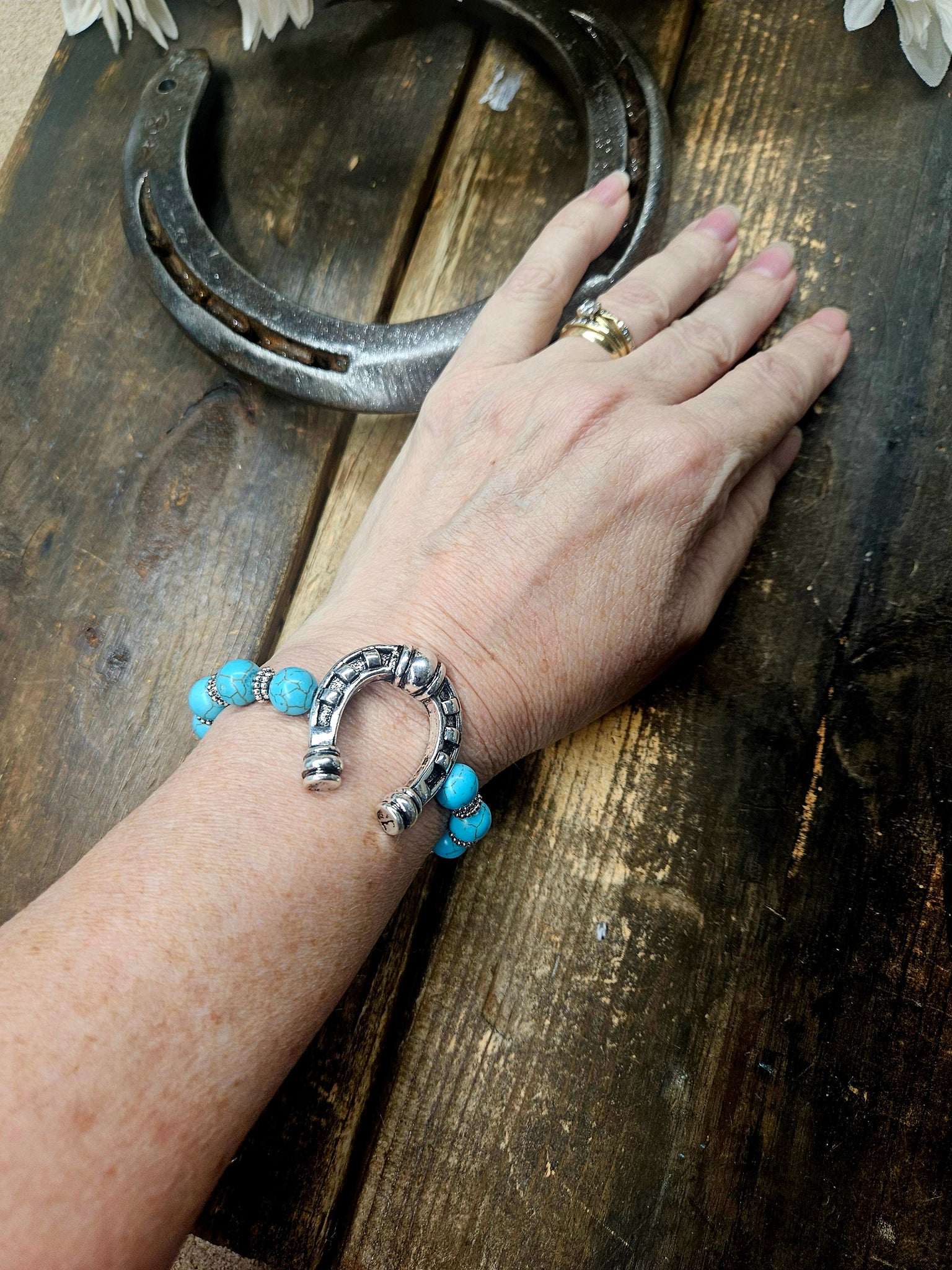 The cute stretchy turquoise bracelet with a beautiful Lucky Horseshoe is the perfect accessory to any outfit.